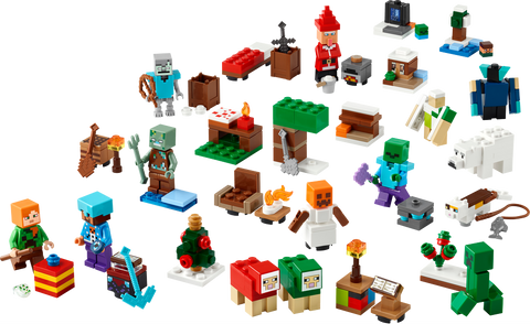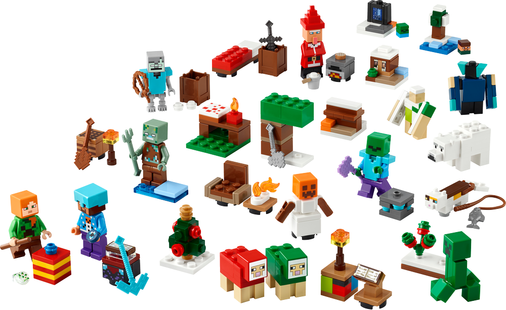 LEGO® Minecraft® Christmas minifigures – Minifigures include Alex, Steve, a Creeper™, drowned, stray, snow golem, zombie and a Santa villager, all with accessories and festive touches